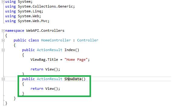 Go to the home controller and add an action method for Add View. This controller is an MVC controller, not a Web API controller. Add a View page for displaying the data using created Web API, in AJAX table. Add the below code in the controller.