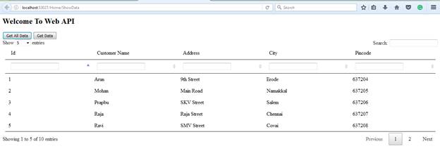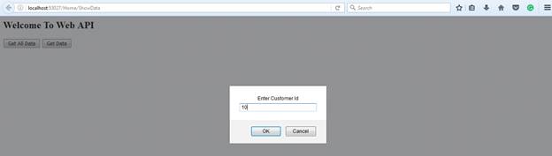 We are going to call our web API using Ajax. We are writing Ajax code inside the button click event. We created two buttons, one for getting all data (Get All Data), another one for getting specified data (Get Data) based on customer id. Add the Ajax code in the same view page. Add below ajax code.