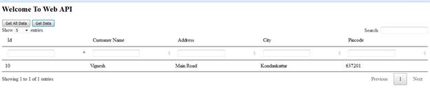 If you need particular customer details click “Get Data” button, give customer id, and get specified data which looks like the below screen shot.