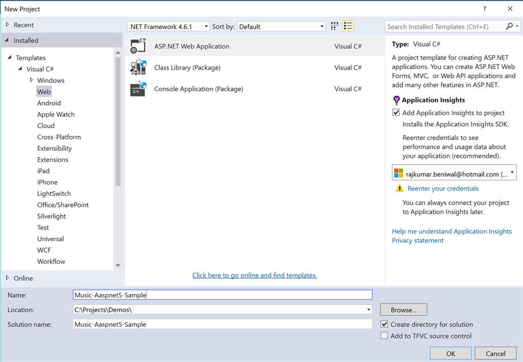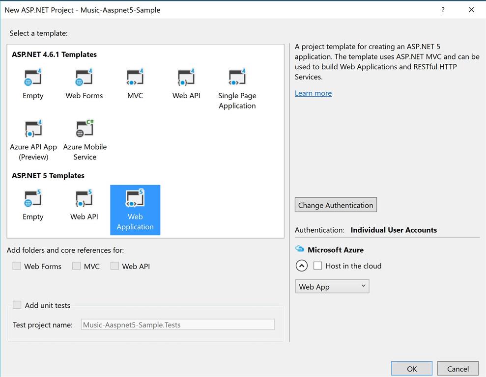Select Web Application from ASP.NET 5 Templates, Do not change the authentication method and click OK.
