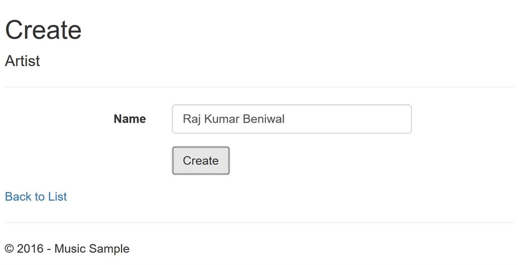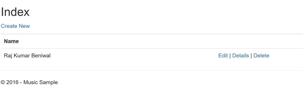 Once you click Create button, as you can see one artist has been added in your list. Here you can edit, details and delete also.