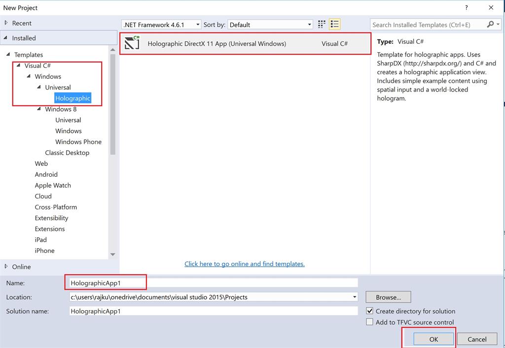 - Click on Holographic DirectX 11 App (Universal Windows)