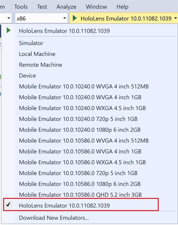 The emulator allows you to run apps on Windows Holographic in a virtual machine without a HoloLens. This package also includes holographic DirectX project templates for Visual Studio. Download here