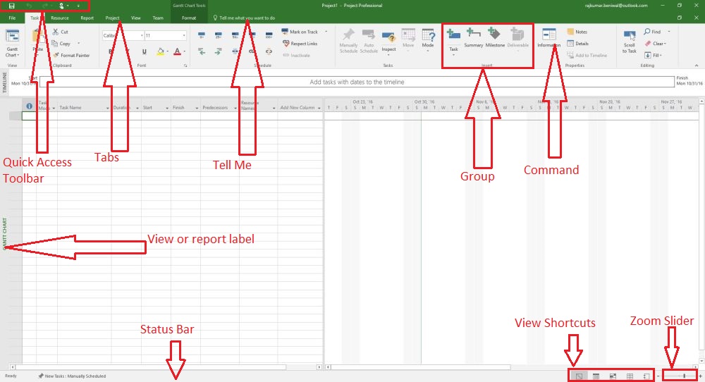 Ribbon contains the commands, which you use to perform actions in Project. Tabs on the ribbon, organize the major features and commands in Project into the logical groups. The tabs on the Project ribbon are discussed in detail later in this topic.