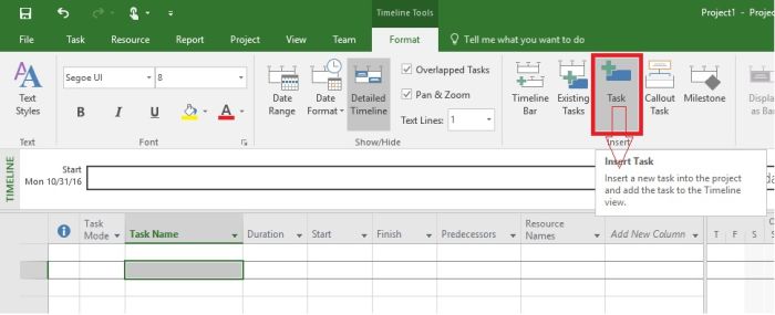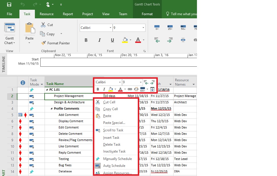 Right click on a task name or other value to see the available shortcut menu commands and the Mini Toolbar.