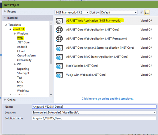 Then, select ASP.NET web application from Visual C# -> Web template. Give project name and click OK.