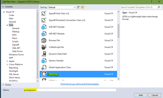 Select Online -> Search for “typescript” -> Download latest version of Typescript for Visual Studio 2015.