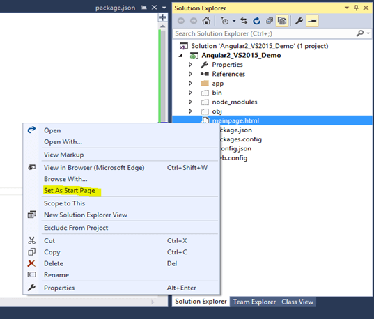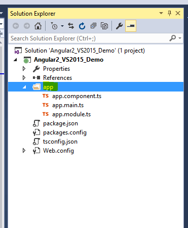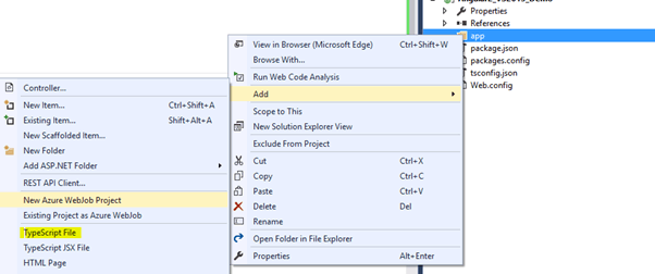 Right click on the solution and add new folder and name it as “app”. This folder will hold the typescript file like module, component and main page.