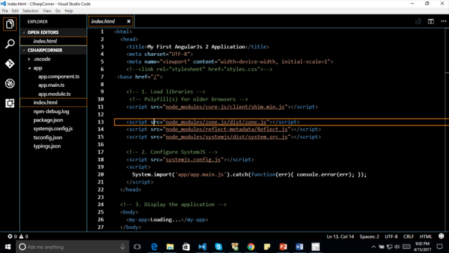 In this article, I am going to explain firstly how to configure an Application architecture, using Angular2 with Visual Studio code. In this, I am using systemjs.config.js to load modules compiled, using TypeScript compiler. There are lots of ways to load the modules in Angularjs2 e.g Webpack, Gulp, Grunt, etc. but I am going to develop an example, using systemjs.config.json.