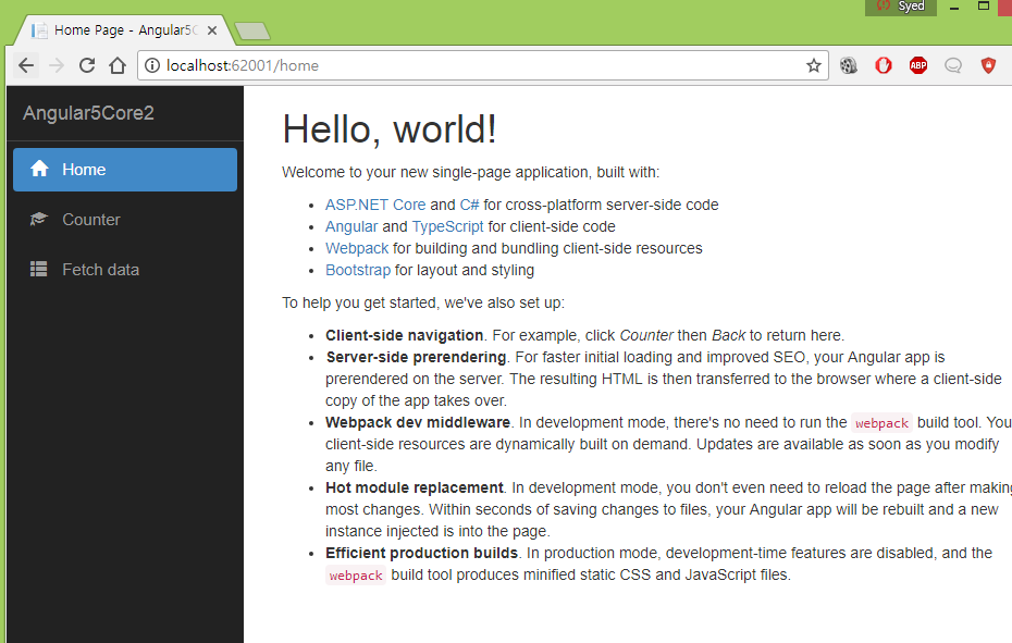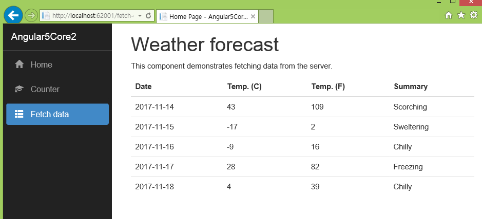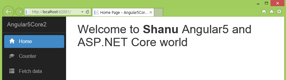 When we run the Angular 5 ASP.NET Core application, we can see the default home page with left side menu and Counter and Fetch data. Yes, in Angular5Core2Template, when we create a new project, by default, 3 components and an HTML file are added to Angular 5 demo - Home, Counter, and Fetch data.