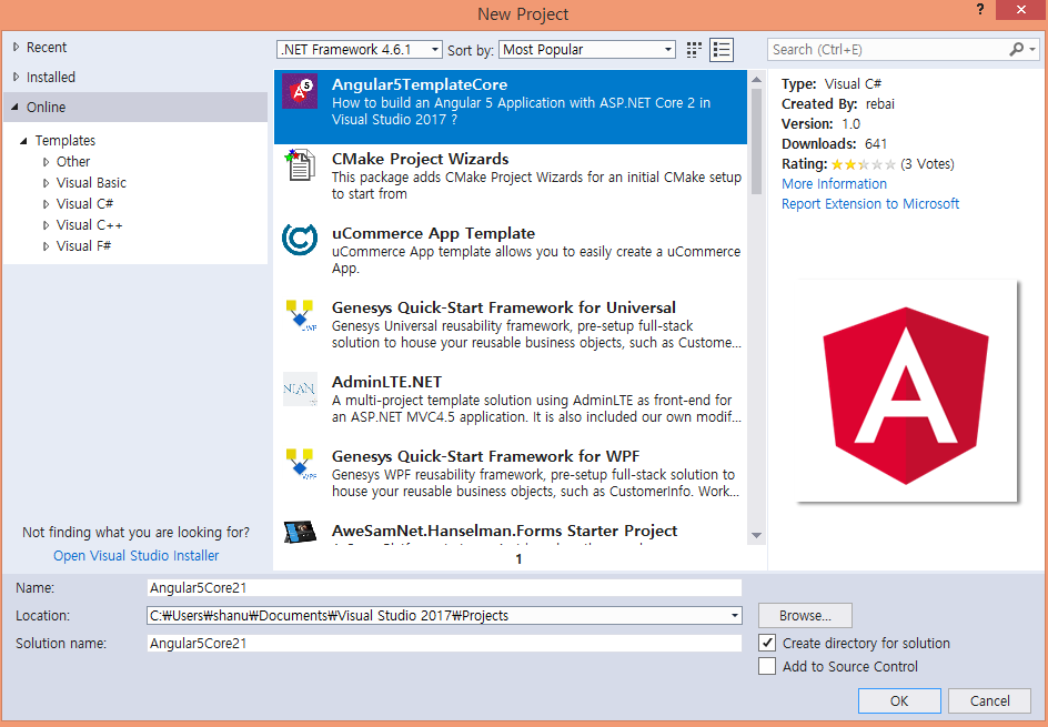Open Visual Studio 2017 and go to File -> New project. Select Online from the left menu, then select Visual C#. From the list, search for Angular5TemplateCore and click OK.