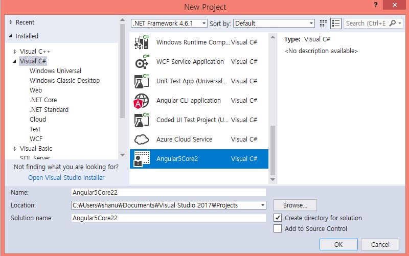 Click New >> Project. Select Visual C# >> Select Angular5Core2. Enter your project name and click OK.