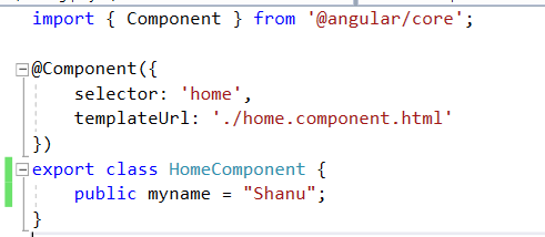 For this, first, we edit the home.components.ts file. Here, in Home Component class, I have created a public variable to display my name as “myname”.