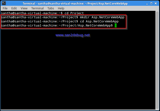 - Type mkdir ASP.NETCoreWebApp, cd ASP.NETCoreWebApp and enter in the command line, as given below.