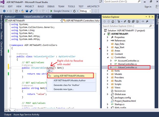 Now go to your Web API controller and open the controller folder where you can find the Values Controller and click on it. In MVC if we want to call something then we have to use MVC controller, on the other hand, in Web API, if we want to call something we’re using API Controller.