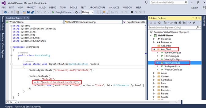 To find this expand App_Start folder from the solution Explorer and select RouteConfig.cs file. You can find MVC default route under this file. When request comes to MVC it takes a URL and parses the first three segments of the URL so the first segment is controller, and then we have the action which finds the method inside this controller, and finally we have a default or optional ID parameter here.
