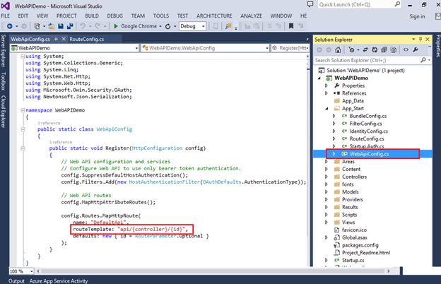Just like MVC Routeconfig file, we have WebApiConfig.cs file for the Web API. In the AppStart folder you can find that file. So just like in RouteConfig file, we have the default Web API route in the Web API. Web API routes prefix with api, and we can choose this name as anything like inverse API, Facebook API or whatever is our requirement. With the prefix api we also have controller and Id as well, the thing is that we don’t have actions here, the reason behind that is the Actions are HTTP methods and depending on the client request, for example if you have get request, then get() method would be called; if you have post request, then post() method would called.
