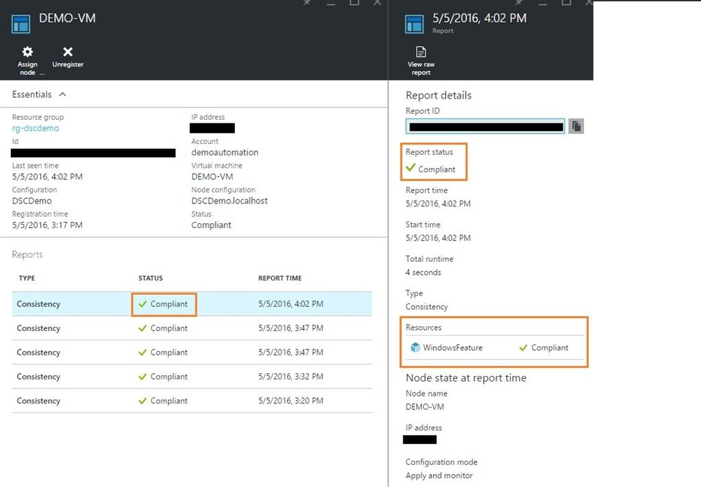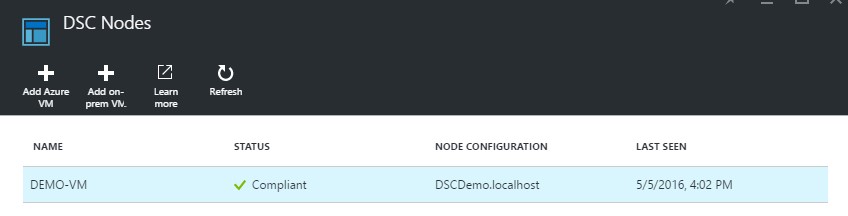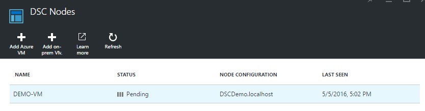 Once the VM / node is registered, you will be able to see it under the list of registered VMs in automation service’s dashboard under DSC Nodes.