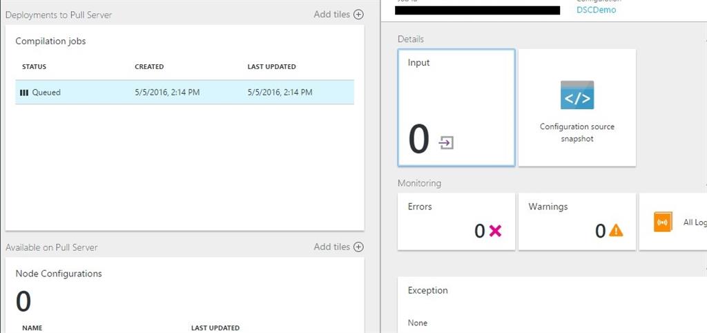 Once you click compile, you will be shown a message that “Are you sure you want to compile this configuration? Any node configurations generated will be automatically placed on the Azure Automation DSC pull server. If node configurations with the same name exist on the pull server, they will be overwritten.” – click yes.