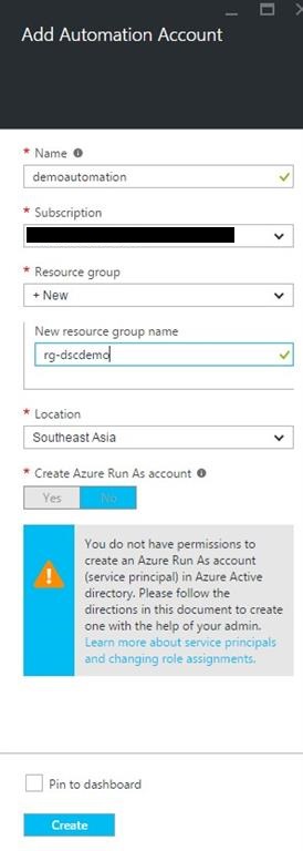 Let’s go ahead and create Azure automation service using new Azure portal. We will name it as demoautomation and will place it under new resource group named as rg-dscdemo