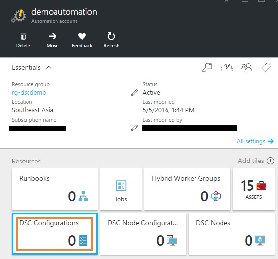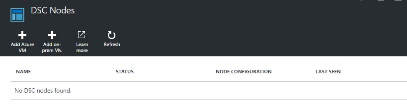 Since we have now registered and DSC configuration and compiled it, let’s go ahead and associate our demo-vm with the node configuration. To do this, navigate to the azure automation service account dashboard and click on DSC nodes tile. It will open up a new blade wherein you will be able to add your machines (Cloud VMs or On-Premise).