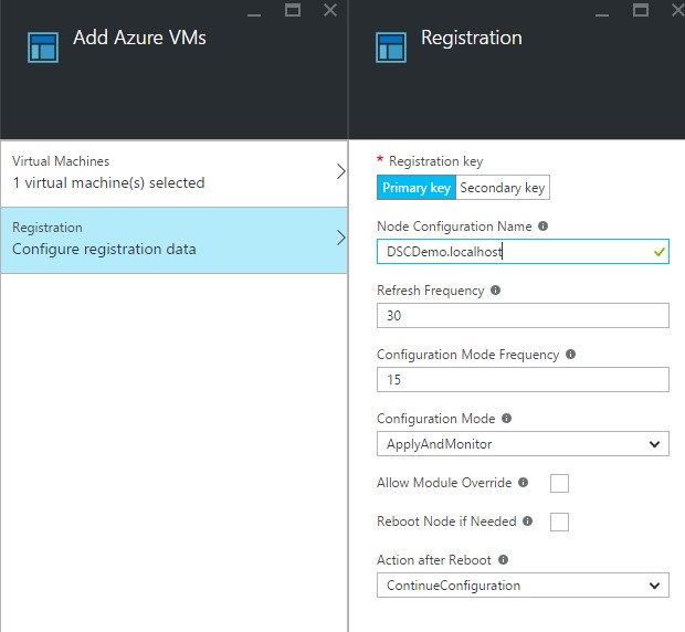 Let’s click on on Add Azure VM, it will open up a new blade asking to select VM to be registered. Select your VM. Now next step is to select the node configuration you want to apply to a VM, and enter the node name. (You can get the node name from automation service dashboard by clicking on DSC nodes tile.)