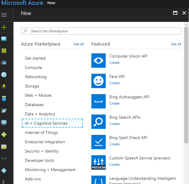- Open Azure portal, click on "Add", and choose category “Cognitive Services” and then select an option of “Bing Search APIs”.