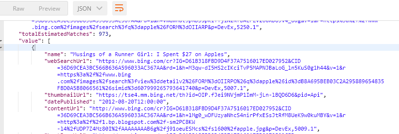 - Install postman and let’s try out this API and try to search any image. For that, paste the URL at postman and provide the request headers and the key. You can paste what you grabbed in previous steps and mention the query string. Here, I mentioned – apple.