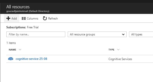 - Go the “All resources” section and see the newly created “Cognitive-service” named as “cognitive-service-25-08”.
