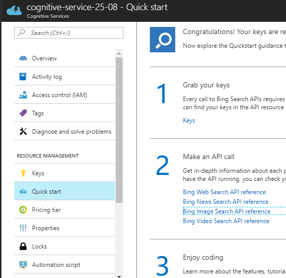 - In the opened section of the cognitive-service, click on the “quick-start” option and see all four steps.