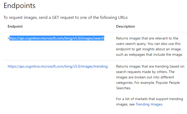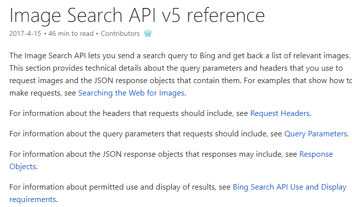 - Click on the second option and choose “Bing Image Search API reference”.