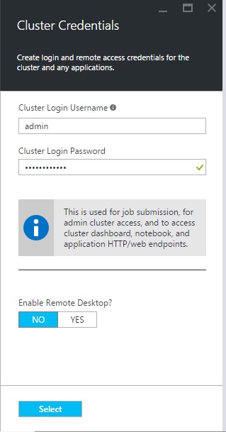 In the new HDInsight Cluster account blade, specify the desired configuration for the HDInsight Cluster account (Cluster Name, Cluster Type, Cluster Operating System, HDInsight Version, Resource Group, Credentials, Data Source, Node Pricing Tiers & Optional Configuration).