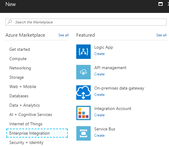 - Open Azure portal, click on "Add", and choose category “Enterprise Integration”. Then, select an option of “Service Bus”.