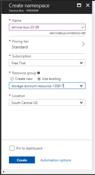 - Fill in the details. Use the existing resource-group and create a namespace within the Service Bus.