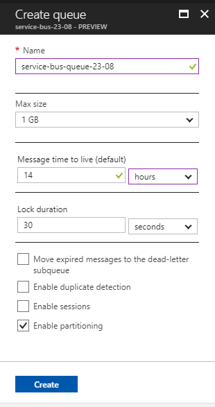 - Fill in the details based on the requirement and create a queue within the Service Bus.