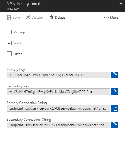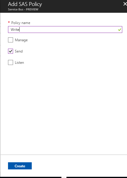 - Click on the “Write” policy and see the “Primary connection string” there. Whatsoever would like to write anything into the queue, provide this connecting string along with the primary key to the person to access the same.
