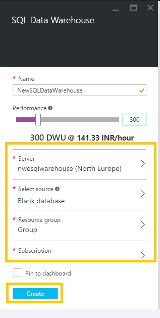 In the SQL Data Warehouse account blade, specify the desired configuration for the SQL Data Warehouse account (Name, Performance, Server, Select Source & Resource Group). Click Create button at the bottom of the screen to create the new database.
