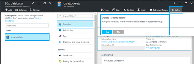 Here, I have created Azure SQL database name ‘creattodelete’.