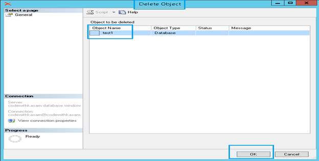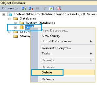 Right click on the database that needs to be deleted, and click Delete from options available, as shown in the below image.