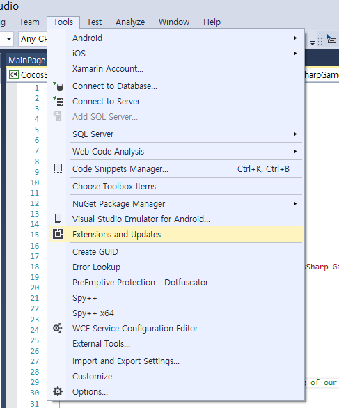 To add the CocosSharp template in our Visual Studio, first, add the extensions in tools option.