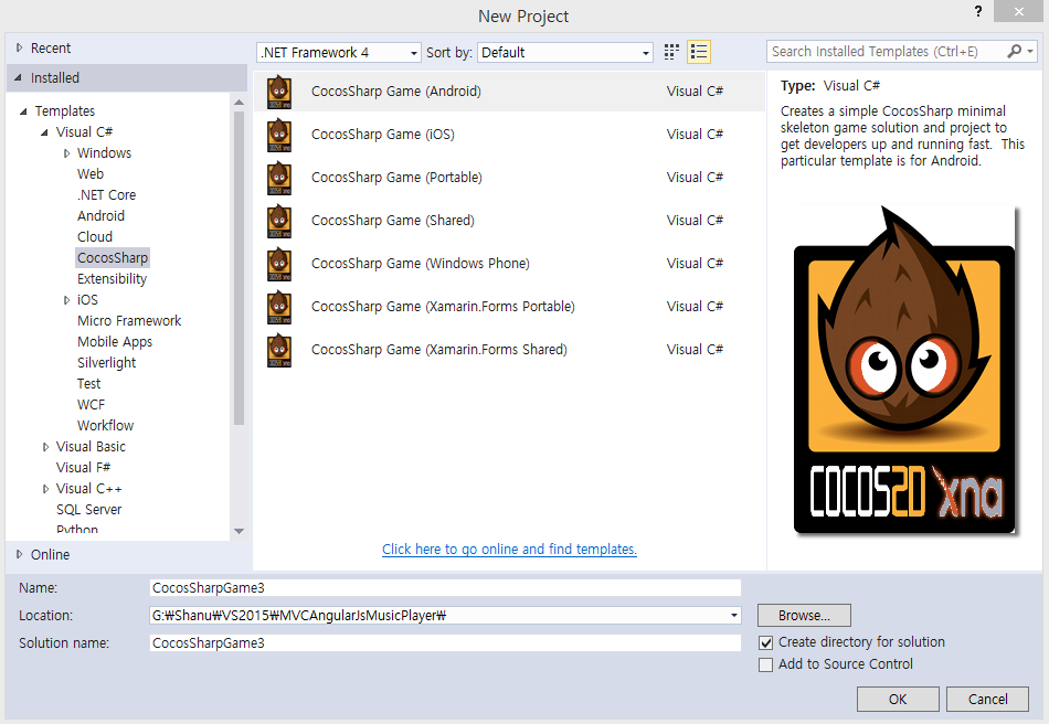 After Installation, open Visual Studio 2015, click create new project and select CoCosSharp from the left side templates. Select your CoCosSharp Development as Android, iOS or Windows. In our example, we will be using for Windows Phone.