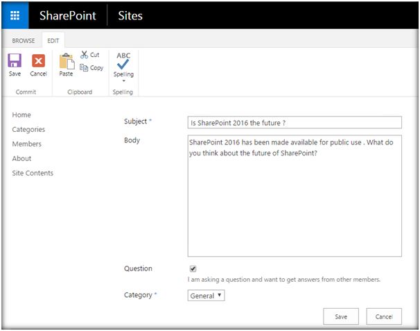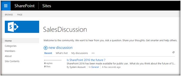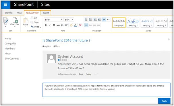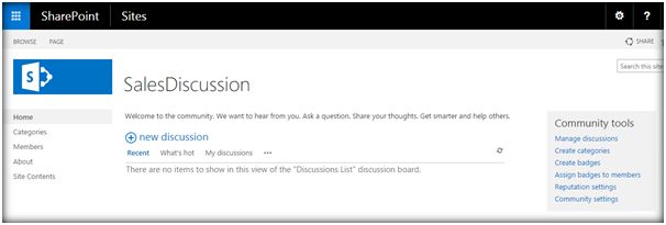 SharePoint 2016 comes with a Community Site template that helps the team hold a forum discussion. This site template was first introduced in SharePoint 2013 as an improved “Social Feature” so as to encourage open communication and information exchange. It also promotes active participation via reward system like badges and reputation. Community site comes as a Site Templateas well as a feature that can be activated in a normal team site. If we go to the site features section of a Community site we can view the Community Site Feature activated. How to create a Community Site We can create a community site from central administration by selecting the Community Site from the Site Templates section while creating the Site Collection. Add the site collection administrator and click on create. This will create the Site collection for you. We can start new discussion by clicking on new discussion button. This will navigate to the discussion post creation page. Here we can create a new discussion post and give details about the discussion intended. Once the discussion is created it will appear in the home page. Site users can now click on relevant discussion and add their replies and views. You can also Like the replies and posts. Now we have forum where multiple discussions can be hosted. Community site also provides options to generate community badges, reputation and categories which will enhance the community experience. Members usually gain reputation points by creating posts, replying to a post and liking replies. This is a useful feature to get feedback from employees and for starting a discussion on a topic. There are multiple use cases for a community site which we will explore later. Summarizing, SharePoint helps to maintain a forum within the intranet for organizational discussions using Community Site. In the upcoming articles we will see how to implement multiple use cases using Community site and explore in deep the social features associated with it.