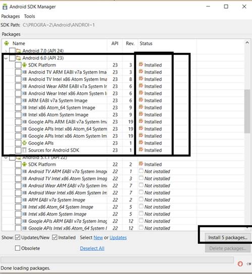 You can verify all the required SDKs, which were installed in Visual Studio. If you do not have the latest SDK and tools installed, download the required SDK tools and API. Go to Tools menu =>Android =>Android SDK manager. Android SDK manager Window will visible in your system, as shown below.
