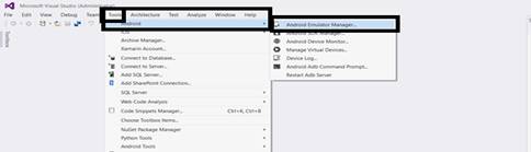 In order to run the Android wear Application we need to first setup an emulator. You can create one by following the steps given below. Go to Tools in Visual Studio > Andriod > Andriod Emulator Manager, as shown below.