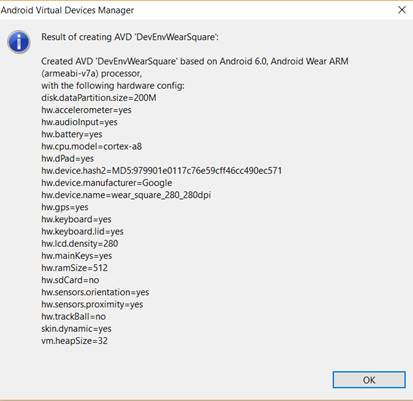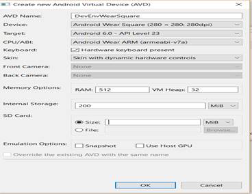 If you get any error "No CPU /ABI system image available for this target”, it means target SDK is not installed. You can choose different target or install specific target SDK. When creating the device, make sure that the correct target of the OS is selected, but especially that the CPU is Android wear ARM. After creating an emulator, you will receive the message for the confirmation