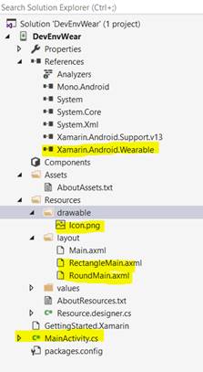 In the Solution, include Xamarin Android wearable reference and icon for tile image, 3 layout for rectangle, round watch and phone layout with common MainActivity class.