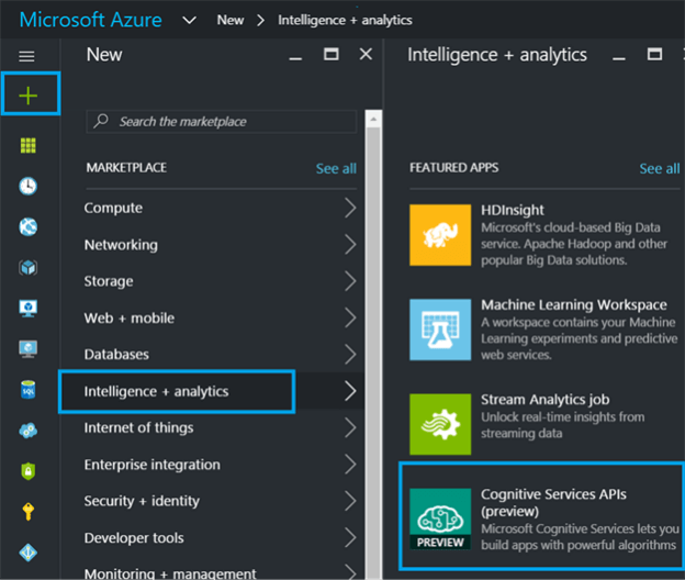 Once done with the account creation, click '+’ => Category, Intelligence + analytics => Services, Cognitive Services APIs.