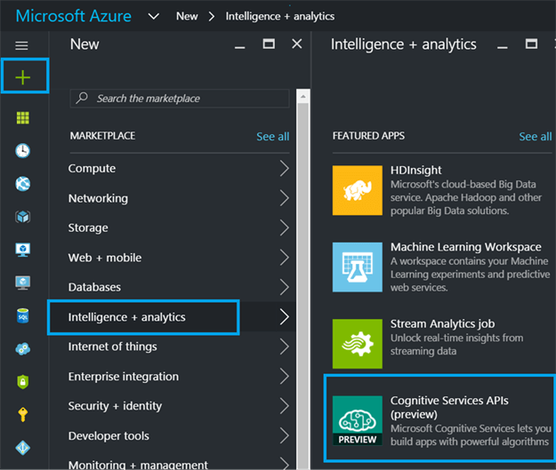 Once done with account creation, Click '+’ => Category, Intelligence + analytics => Services, Cognitive Services APIs.