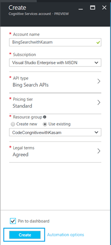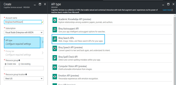 This Bing Search APIs are just one call away — and available ad-free. We will learn more about Bing Search API in later articles. To start with, let's create Cognitive account to use Bing Search API, using Azure Portal.