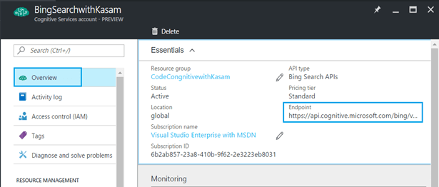 Overview => Will list all details associated with Bing Search API Cognitive account.